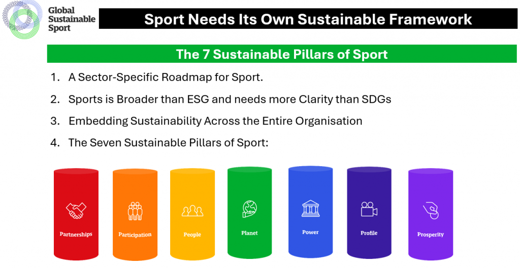 That’s why Global Sustainable Sport (GSS), in collaboration with leading academics and practitioners, has developed a robust framework designed to help sports organisations assess, develop, and communicate their sustainability performance and their positive impacts on society and the planet.