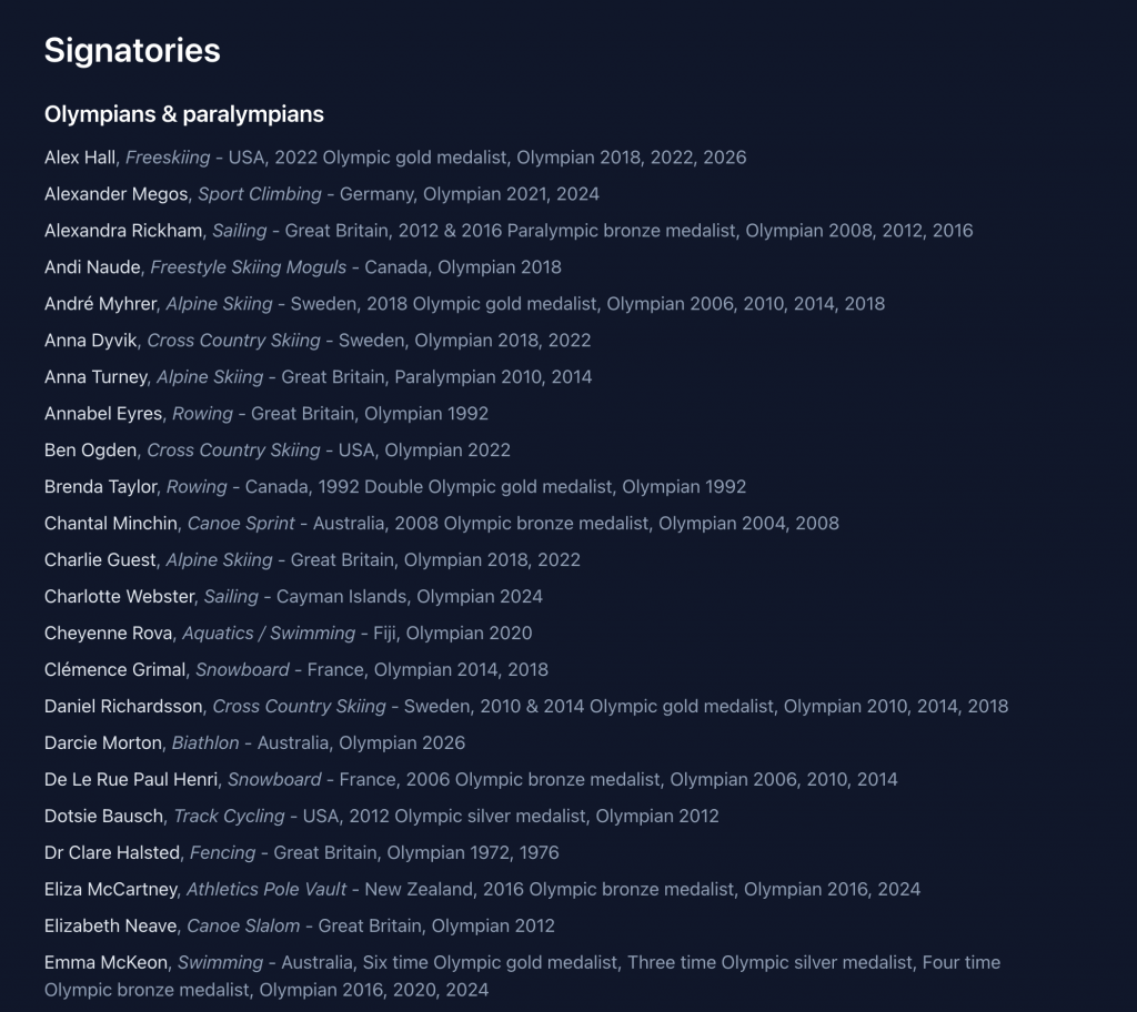 Biathlon – a sport uniquely sensitive to snow reliability and temperature stability – is also strongly represented. Three-time Olympian Susan Dunklee (USA) has added her voice alongside emerging athletes such as Maya Cloetens (Belgium) and Ukaleq Slettemark (Greenland), highlighting how climate volatility is already affecting winter sport in both established and emerging regions. For these athletes, the erosion of winter conditions is not a future risk but a lived reality, with training schedules disrupted and venues increasingly dependent on artificial snowmaking.